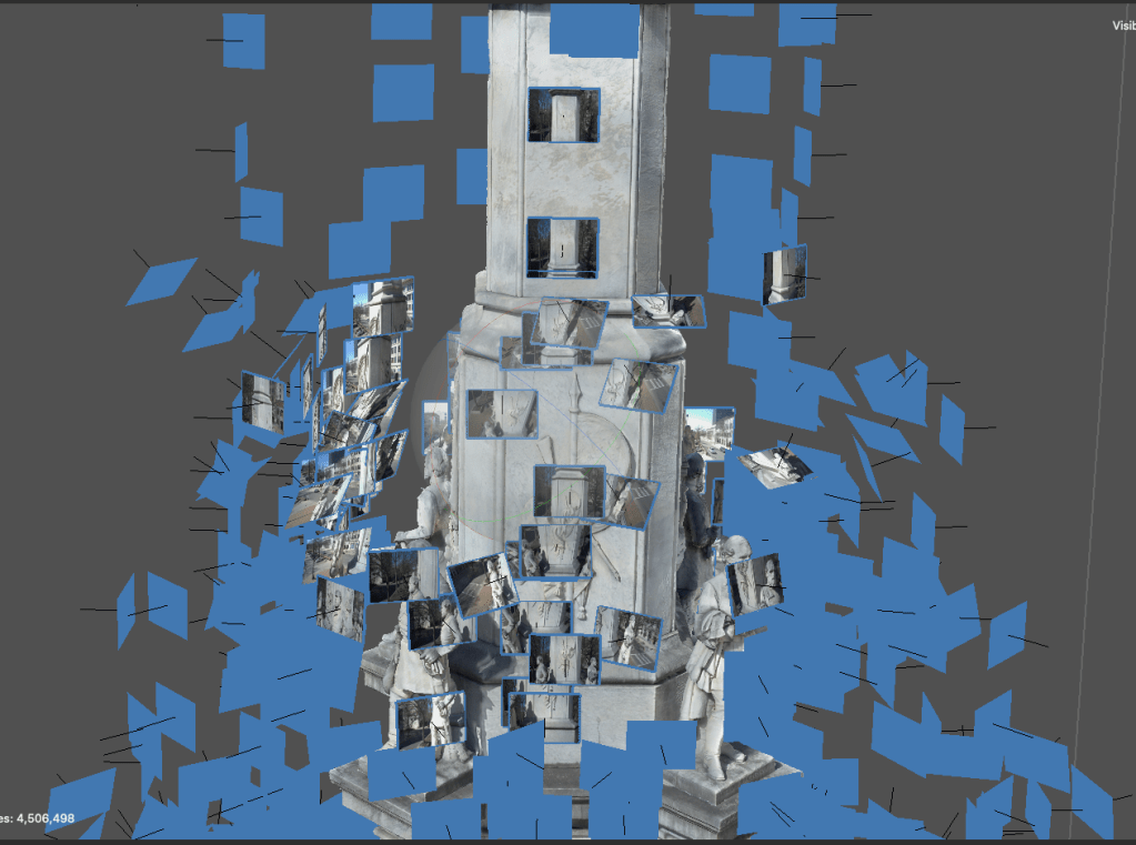 This model is of the Broad Street Confederate monument. This model was produced by about eleven hundred photographs that took up over twelve gigabytes of storage space, and an hour of aerial flight time. The three images below are taken from the program I used to produce the model. The first two are of approximately the same position and scale. The blue rectangles in images two and three each represent a single photograph that was taken and oriented in position by the software in order to render the model. This illustrates the sort of photographic coverage that is required to produce a model.