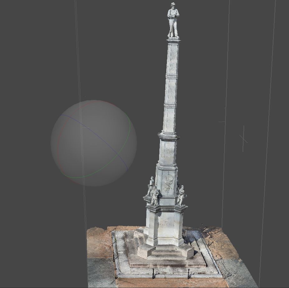 It is a process in which approximately a zillion still photographs are stitched together by a computer program which spits out a three-dimensional model of an object. The process varies depending on the nature (and scale) of the object being modeled. For something relatively small, it may be ten or twenty pictures taken while you move around the object as it sits on your kitchen counter. If the object is a little bit bigger, it’s a hundred pictures taken of an object you walked around. But what if the object is REALLY tall. Taller than whatever the highest you can reach up and hold your camera. Then you need aerial photography. So, that’s what I did. That’s how I made the three dimensional models of monuments that are on this site.