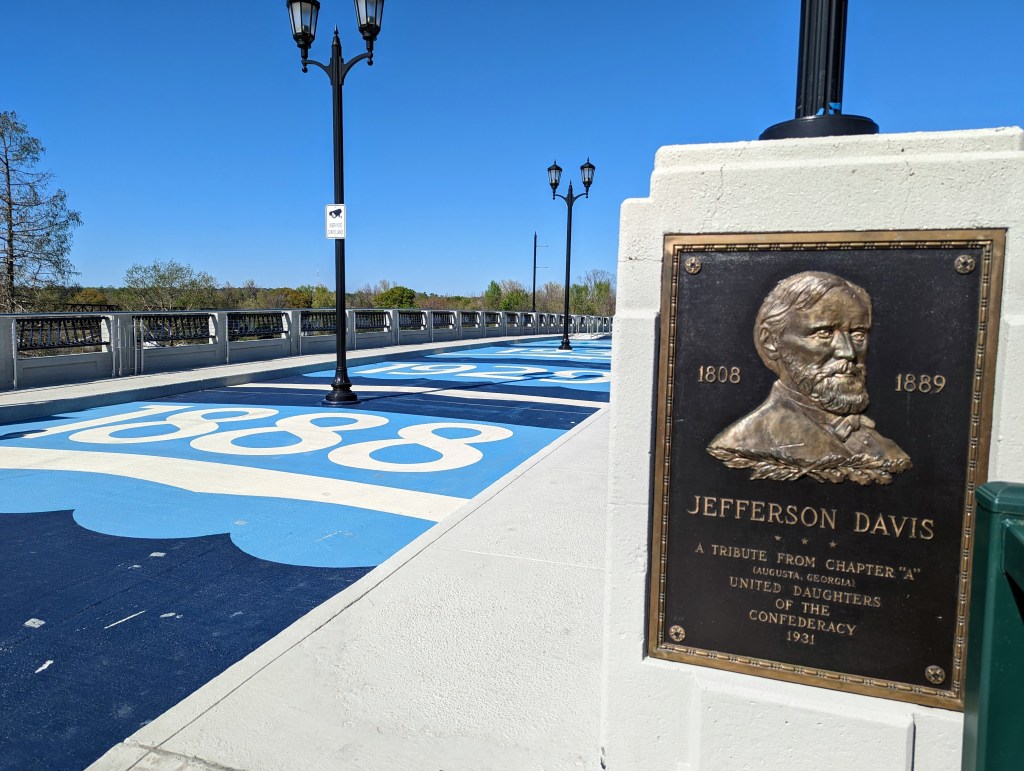 There are a series of monuments and parks in North Augusta, South Carolina that are tied, in some way, to the Hamburg Massacre, and to broader white supremacist violence of 1876. The Meriwether Monument sits in Calhoun Park in North Augusta, between Georgia and Carolina Avenues, below West Forest Avenue, just up the hill from downtown. It celebrates the “young hero of the Hamburg Riot.” The Jefferson Davis Memorial Bridge, now a pedestrian-only bridge linking Augusta with North Augusta, is at the site of the brutal murders of Black men at the hands of a white mob during that event. It boasts multiple plaques honoring Jefferson Davis, erstwhile president of the Confederacy. Wade Hampton Veterans’ Park in downtown North Augusta honors the former Confederate general who was the political beneficiary of the election violence of 1876.