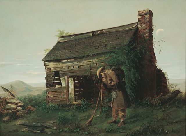 Henry Mosler was a German-born painter who eventually settled in Cincinnati, Ohio. He traveled with the United States Army as an artist-correspondent for Harper’s Weekly from 1861 to 1863. The Lost Cause depicts a soldier returning home to an empty, dilapidated home. Its companion piece, Leaving for War, shows a soldier leaving the same homestead while looking back to his family.