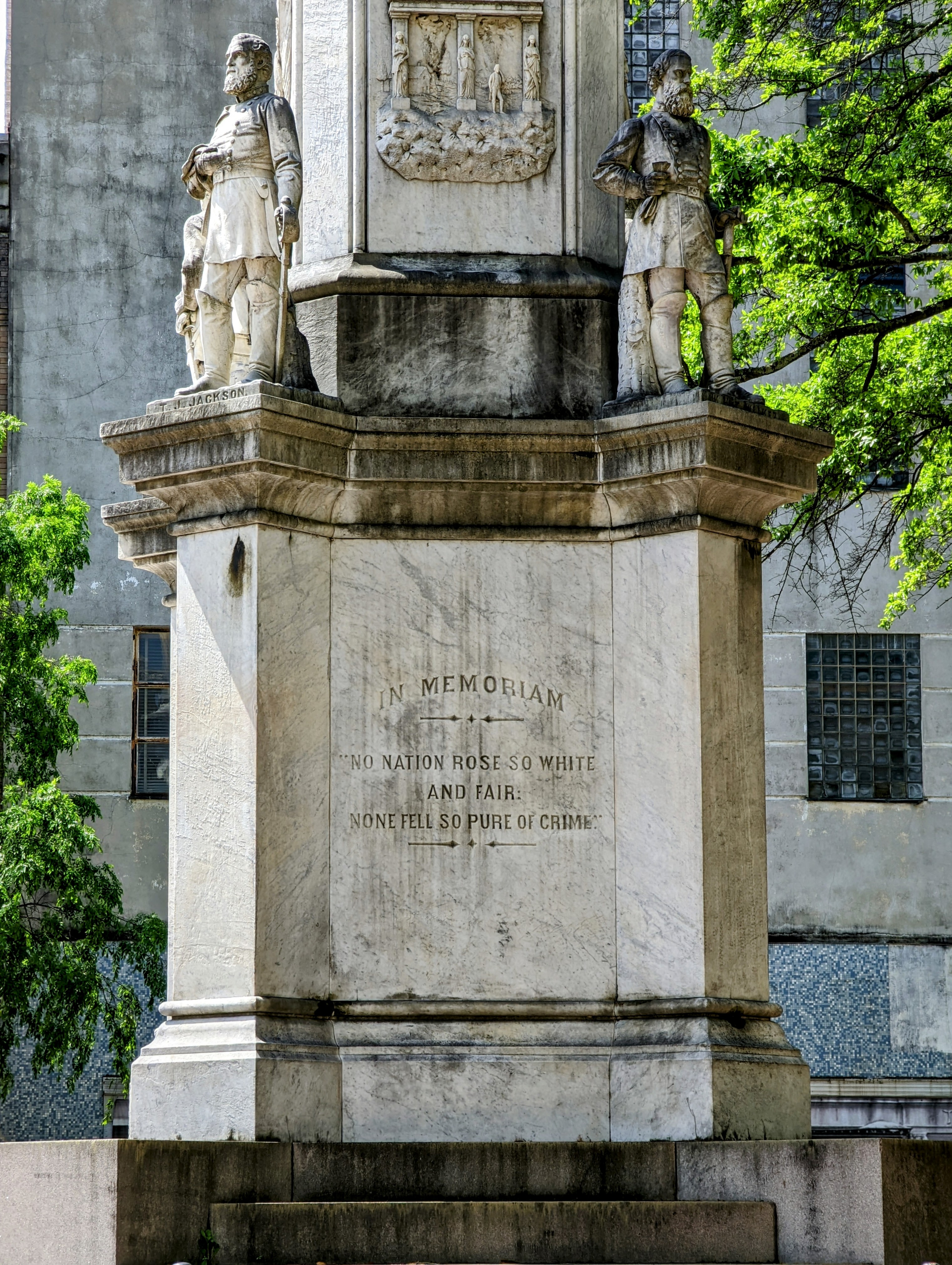The Broad Street monument was at the leading edge of a shift in monument construction. In the first decades after the war, most Confederate monuments built in the South were constructed in cemeteries or battlefields, generally for mourning the dead. Nationwide, most Confederate monuments were constructed in the 1890s as expressions of Jim Crow-era white supremacy that overtly support the Lost Cause. The Broad Street monument is an early example that does the latter. The base of the monument has a series of inscriptions glorifying the Confederacy and its cause.