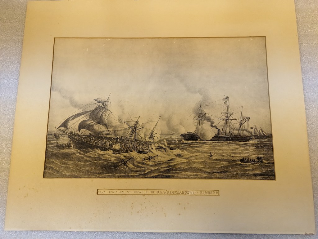 This print depicts a famous naval engagement between the Kearsarge and the Alabama, a Confederate raiding ship, outside the French port of Cherbourg. The Alabama had made multiple successful raiding missions ranging as far as the Indian Ocean and South Pacific. The Kearsarge and its crew had pursued the Alabama over the course of several years. The Alabama had docked in the French port to undergo repairs. It was here that the Kearsarge caught up with the Alabama. Given that the Alabama was docked in the port of a neutral sovereign nation, the Kearsarge had to wait before attacking. The Kearsarge sent word to request the aid of other ships and prepared to attack the Alabama once it left neutral waters. The Alabama was docked undergoing repairs while the Kearsarge loomed offshore for over a week. Eventually, with repairs completed, the Alabama set sail for battle. French naval ships escorted the Alabama as it left port, ensuring that the conflict occurred outside of French territorial waters. The ships fired upon each other and moved in great circles, slowly spiraling around each’s position.